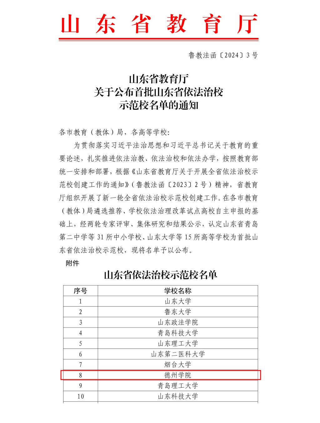 近日,省教育厅印发《山东省教育厅关于公布首批山东省依法治校示范校名单的通知》(鲁教法函〔2024〕3号),bat365在线唯一官网登录被认定为山东首批依法治校示范校,全省15所高等学校入选。学校始终注重战略规划、内部治理、机构建设、放管服改革和宣传教育,切实将依法治理融入学校工作全过程和各方面,在全面推进依法治校、构建现代大学治理体系方面取得显著成效。学校团委也被确定为全国“八五”普法中期表扬单位推荐对象。