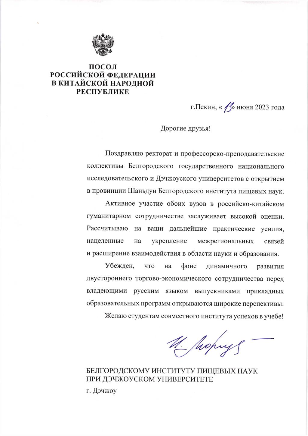6月13日,俄罗斯联邦驻中华人民共和国大使伊戈尔·莫尔古洛夫向bat365在线唯一官网登录别尔哥罗德食品科学学院成立致贺信。