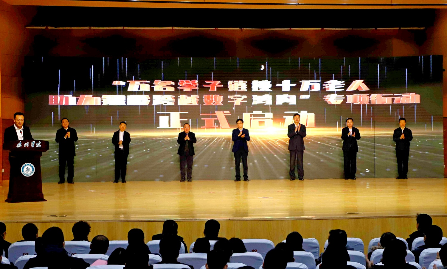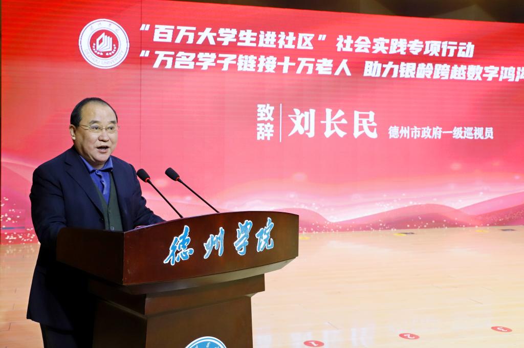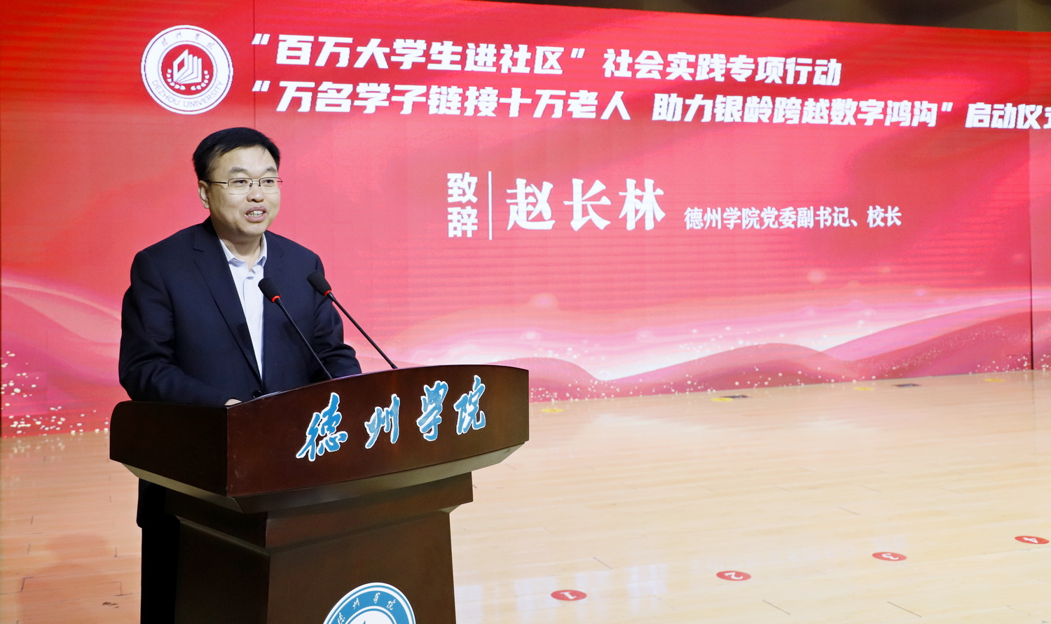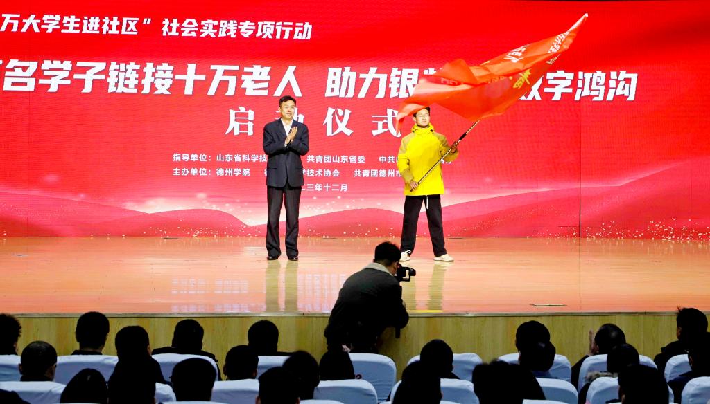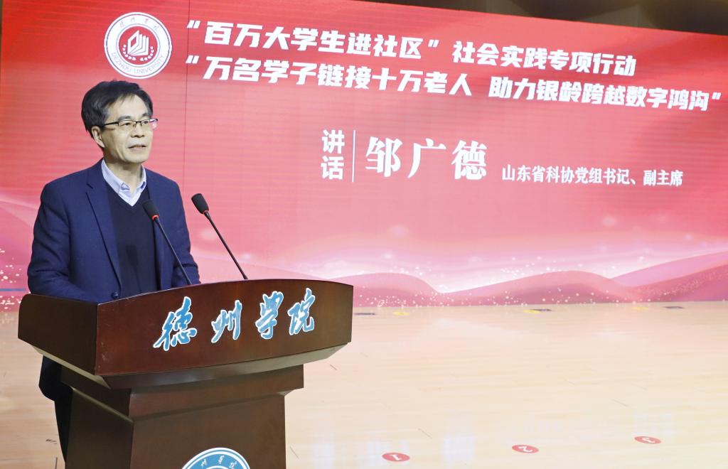 12月29日,“百万大学生进社区”社会实践专项行动“万名学子链接十万老人 助力银龄跨越数字鸿沟”启动仪式在bat365在线唯一官网登录隆重举行。山东省科学技术协会党组书记、副主席邹广德,共青团山东省委副书记、省青联主席尚胜波,德州市政府一级巡视员刘长民,bat365在线唯一官网登录党委副书记、校长赵长林,党委委员、副校长李甲亮,党委委员、副校长蒋涛涛出席活动。