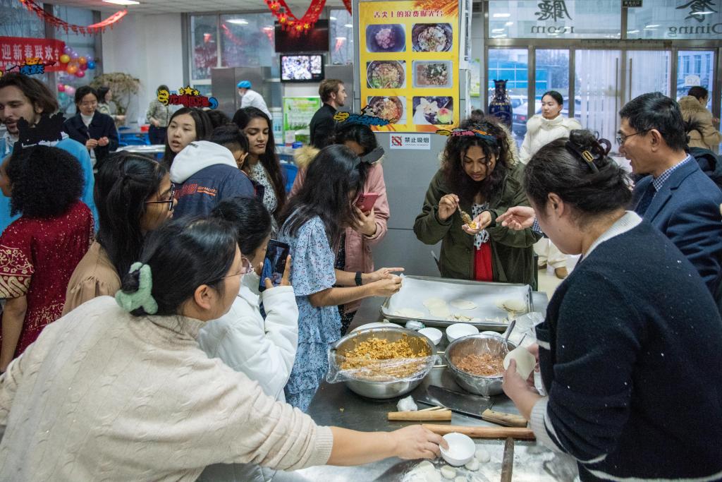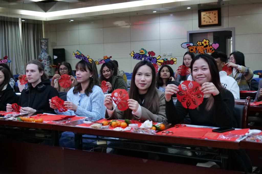 为了让留学生们更深入地了解中国春节的传统习俗,活动精心安排了丰富多彩的文化体验环节。在学剪纸环节中,他们手持剪刀和彩纸,跟随老师的指导,小心翼翼地剪出了一幅幅窗花作品;写春联环节让留学生们体验到了中国书法的独特韵味;随后的包饺子环节,留学生们围坐在一起,亲自动手制作美食,共同感受浓浓的中国年味儿。