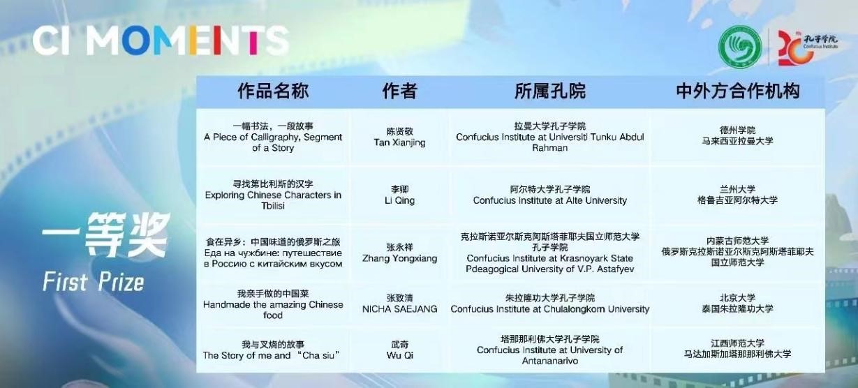 据悉,来自91个国家192所孔子学院(课堂)和相关机构的784部作品参与本次评选,共评选出特等奖3部、一等奖15部、二等奖30部、三等奖100部,20位创作力、表现力突出者获“孔院达人”称号,35家单位获优秀组织奖。