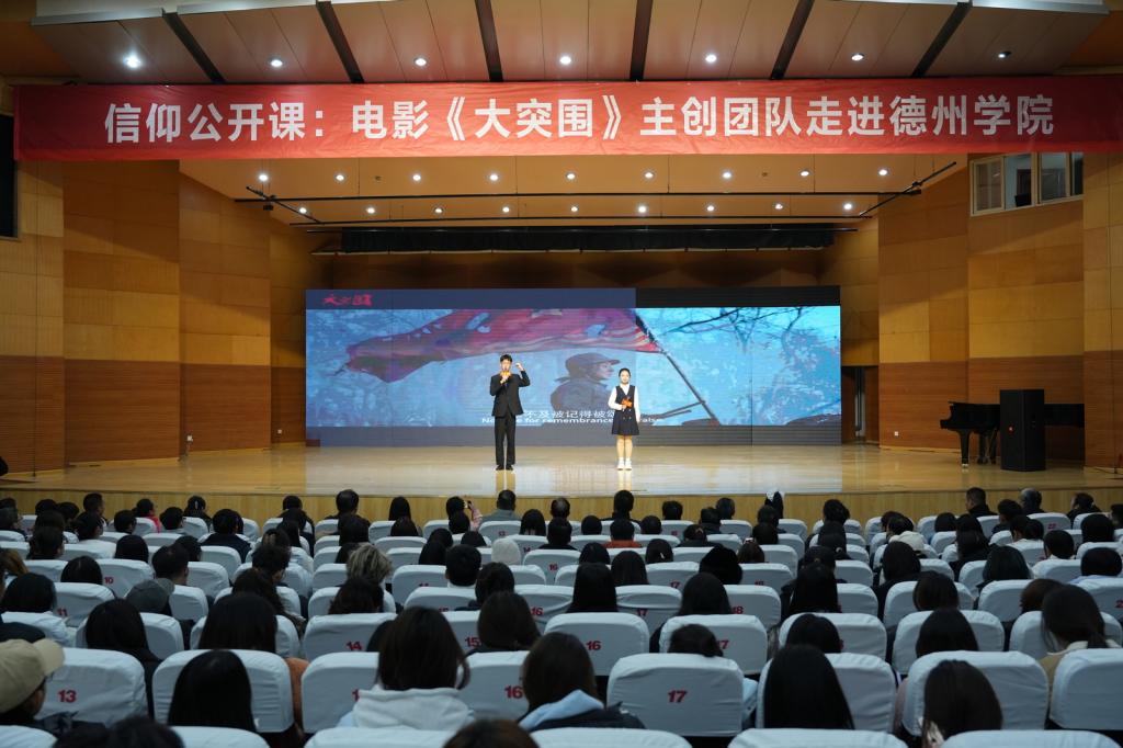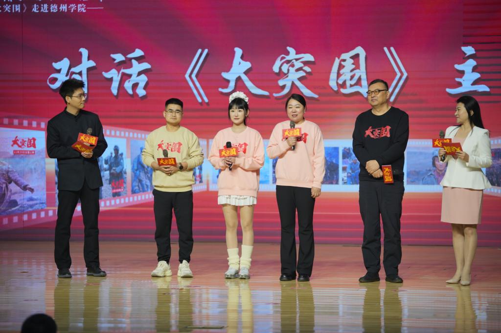 主创团队走上舞台,一一向同学们介绍了影片创作、角色演绎过程中的心路历程,讲述了影片拍摄中的感人故事及难忘经历,分享了战争年代青年与新时代青年认知“青春”“理想”“信仰”的共性与不同。希望同学们在学习生活中不畏困难,勇敢面对,珍惜当下,破困难“大突围”;希望同学们心怀爱国热忱,饱含真挚情怀,明确目标方向,破挑战“大突围”;希望同学们坚定理想信念,提升政治素养,锻炼坚强品格,破自我 “大突围”。