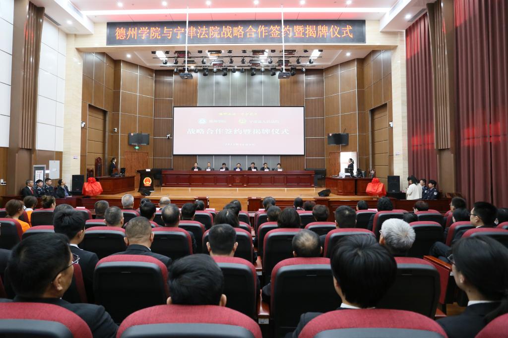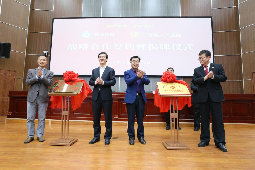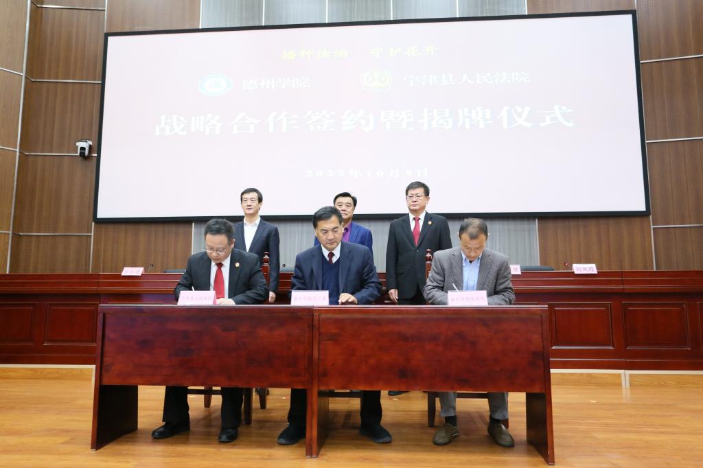 10月9日,bat365在线唯一官网登录与宁津县人民法院“播种法治•守护花开”战略合作签约揭牌仪式在宁津县人民法院举行。bat365关工委主任展德明,德州市中级人民法院党组副书记、副院长刘光辉,宁津县委书记高善玉,宁津县人民法院院长任运通,学校关工委、离退休工作处、法学院师生代表参加。