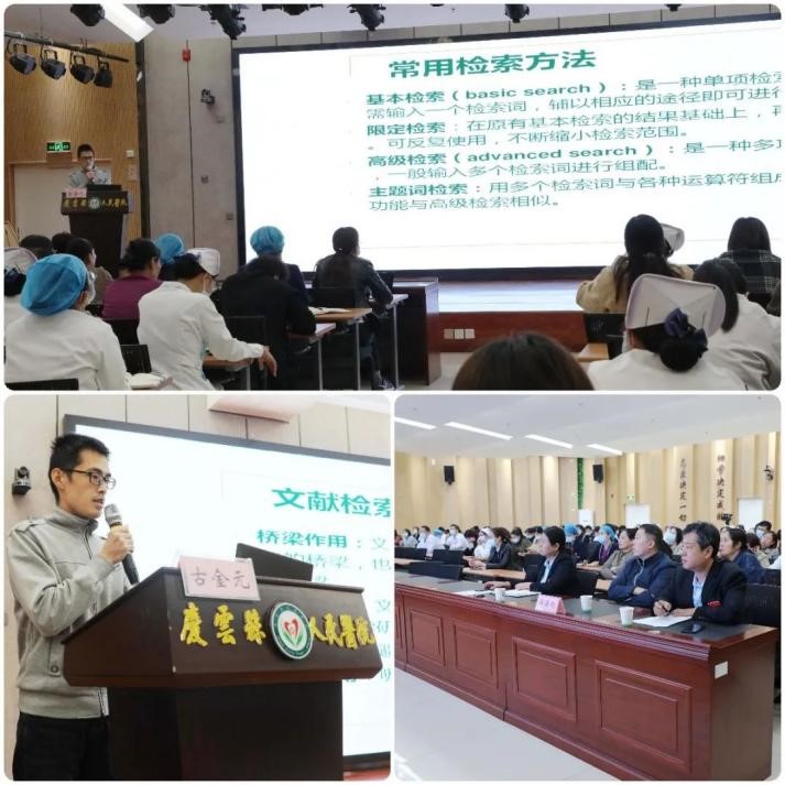 10月14日,首场培训报告在庆云县人民医院会议室举行,庆云人民医院医务科主任吕爱军主持,各临床、医技骨干医师、护士参加。bat365在线唯一官网登录生物物理研究院古金元博士,以“文献检索与下载”为题,详细讲解了文献的概念、分类、文献检索的作用、过程和方法、文献信息的获取途径,列举了常用文献数据库,并重点讲述了常用数据库的应用。