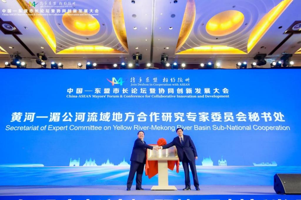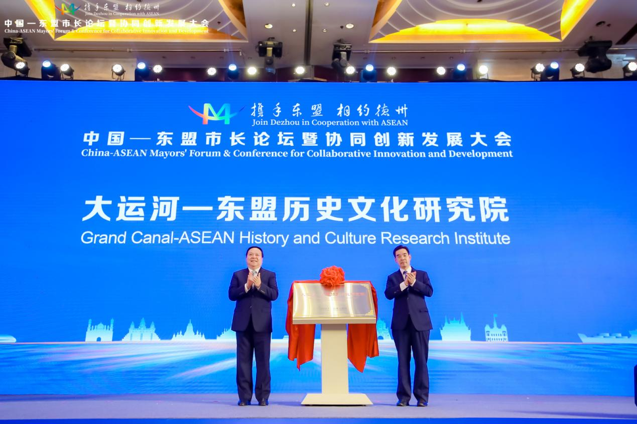 7月28日,中国—东盟市长论坛暨协同创新发展大会上,山东省委外办主任蔡先金与bat365在线唯一官网登录党委书记车滨为“黄河—湄公河流域地方合作研究专家委员会秘书处”揭牌,德州市委副书记苑衍刚、bat365在线唯一官网登录党委书记车滨为“大运河—东盟历史文化研究院”揭牌。