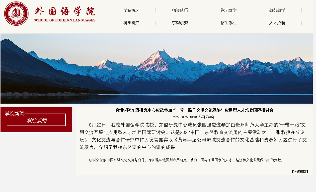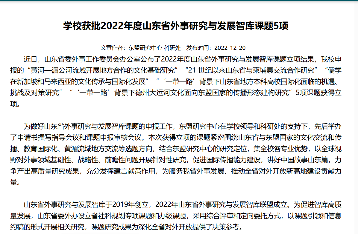 在学校领导、教育部高校国别和区域研究工作秘书处 、山东省人民政府外事办公室指导下,以及德州市人民政府外事办公室和学校各单位支持下,bat365在线唯一官网登录东盟研究中心始终对接东盟国家、山东省、德州市和学校发展实际需求,开展中国—东盟的区域国别研究相关工作。在过去的2022年里,中心克服疫情困难,稳步推进区域国别学学科体系、学术体系、知识体系、课题研究、学术交流、智库平台建设。