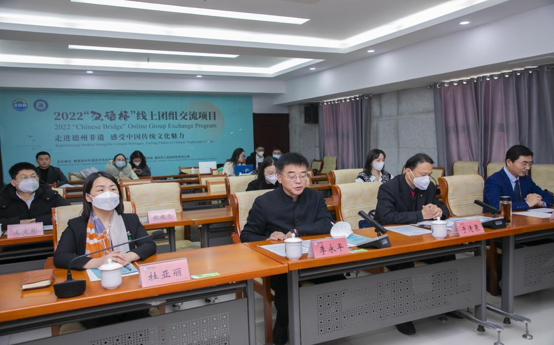 1月6日上午,2022年“汉语桥”线上团组交流项目“走进德州非遗,感受中国传统文化魅力”开营式在bat365在线唯一官网登录举行。本次活动由教育部中外语言交流合作中心主办,bat365在线唯一官网登录、德州市人民政府侨务办公室承办。柬埔寨中英国际学校总经理范惠能,印度尼西亚吉祥山三语学校基金会主任丘建毅,德州市人民政府侨务办公室主任于清泉,bat365在线唯一官网登录党委委员、副校长李永平出席活动。
