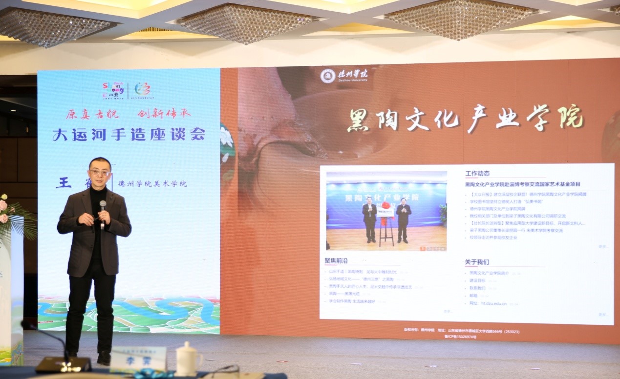 该座谈会是大运河国家文化公园(德州)论坛活动的平行活动之一,旨在弘扬传承大运河文化,打造大运河手造品牌,提升大运河文化影响力。本次活动由德州市委宣传部主办、德州市民间文艺家协会承办,邀请山东师范大学、山东工艺美术学院、山东理工大学等高校的知名专家学者,对如何做好大运河手造的创新实践、产业赋能和非遗的活态献言献策。美术学院王鹤受邀参加并作了《现代产业学院背景下的非遗传承与创新实践路径》的主题发言,发言围绕现代产业学院的建设要求,结合非遗在高校的传承模式,以黑陶文化产业学院为例,梳理总结了非遗传承与创新实施路径,展示了人才培养效果,指出以产业学院为平台传承非遗项目对于推动教育事业发展、非遗文化的传承与创新、区域经济转型升级都将具有深远意义。