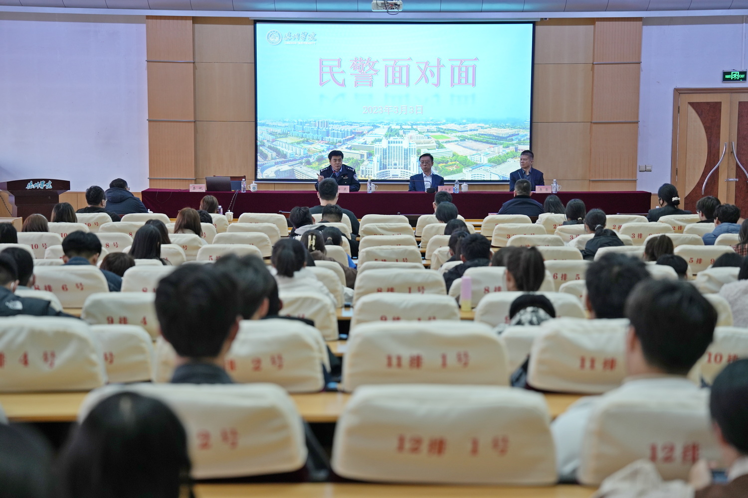 为进一步提高广大师生防范网络电信诈骗的安全意识和自我保护能力,3月3日下午,在厚德楼四楼报告厅举行“民警面对面”主题活动——“校园防范网络电信诈骗专题报告会”。德州市德城区政府副区长、德城公安分局局长郑虎,湖滨北路派出所所长秦治国,学校警务室常驻警官孙卫国大队长,德城分局新型犯罪侦查大队民警娄斌等出席此次活动。bat365在线唯一官网登录党委委员、副校长迟沂军出席了报告会,并在会前同郑虎进行了深入交流。迟沂军指出,防范网络电信诈骗关系到师生的财产安全、身心健康和学校的安全稳定,要进一步推进警校联动、携手共建,大力开展宣传教育,不断提高师生的防范意识、防范能力,营造安全稳定的校园环境。