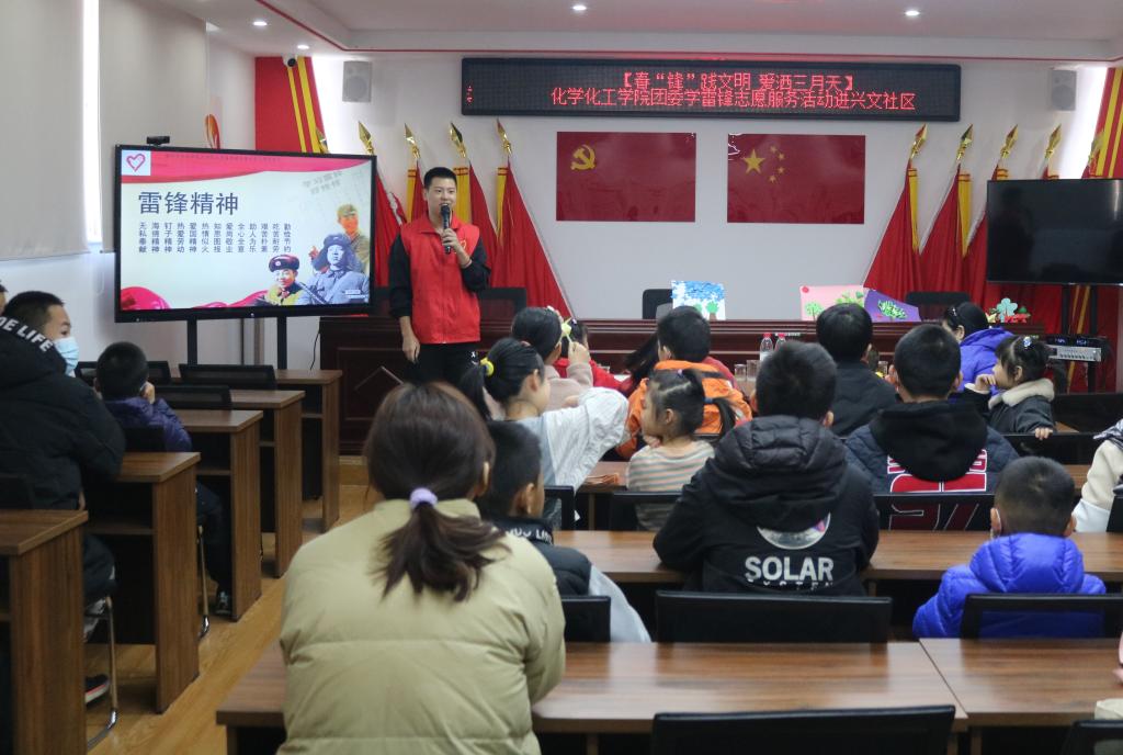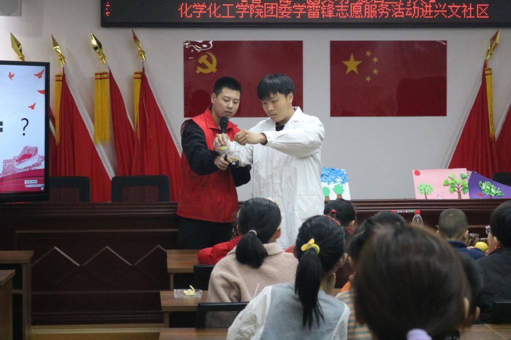 3月12日,化学化工学院“正青春低碳环保科技志愿服务队”赴兴文社区开展“走进化学世界,领悟历史精神”化学实验进社区主题活动。在活动现场,志愿者通过PPT的形式向社区小朋友们介绍了雷锋同志的生平、雷锋精神及其时代内涵,并组织小朋友们集中观看了爱国影片《我和我的祖国》,借此重温雷锋同志的精神外延——钉子精神、爱国精神、海绵精神等。为调动小朋友们的学习积极性、培养动手能力和学习兴趣,服务队成员结合专业知识设计并实施了“维C遇上碘伏”这一有趣的小实验,通过化学的神奇反应现象带领同学们深刻理解雷锋精神的基本内涵。活动结束后,小朋友们兴高采烈地欢呼“学雷锋,树新风”,借此机会志愿服务队全体成员带动小朋友们前往社区内播种“希望之树”,为“志愿红”点亮“生态绿”贡献青春力量。