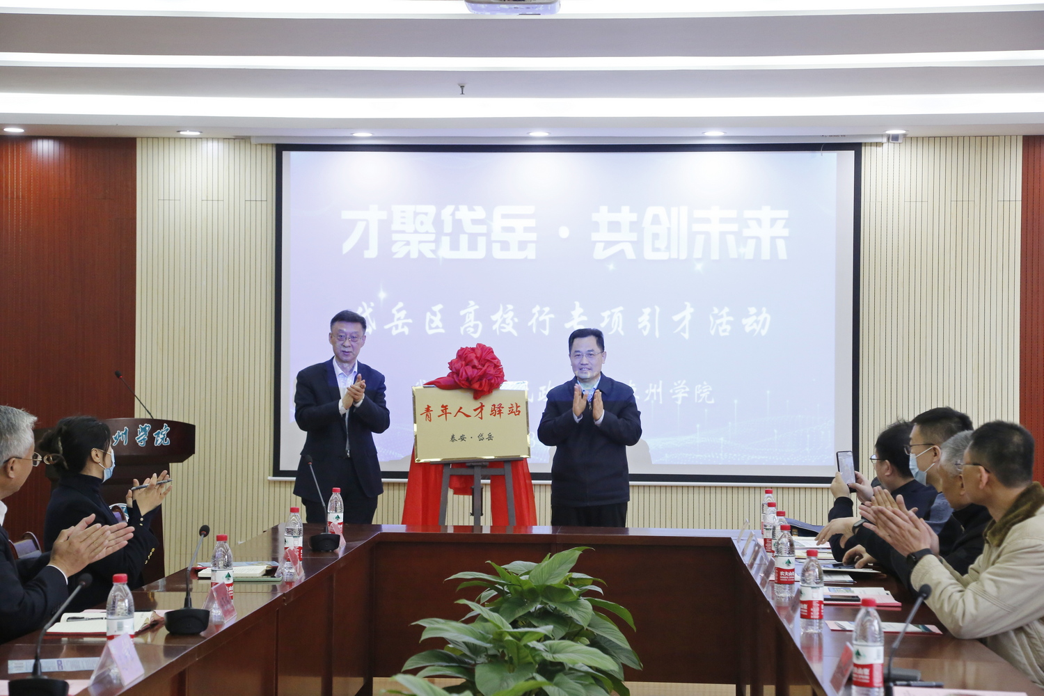 岱岳区委常委、组织部部长、统战部部长王恩东与bat365在线唯一官网登录党委委员、副校长迟沂军共同为“青年人才驿站”揭牌。