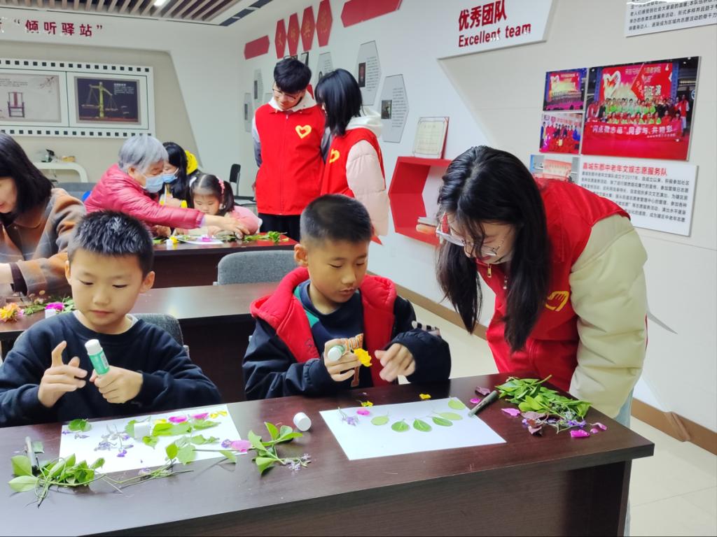 活动中,志愿者向小朋友们介绍了不同树叶的形状、春天常见的植物和描写春天的诗词,讲解了树叶粘贴画的制作过程和注意事项。随后,志愿者们分发树叶和工具,并细心协助小朋友们正确使用剪刀、胶带等制作工具,小朋友们充分发挥自己的想象力,积极地制作树叶粘贴画,将一幅幅创意新颖、构思奇特的作品展示给大家。