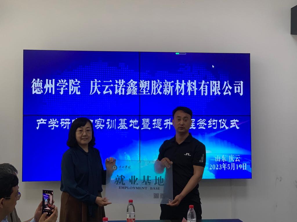 活动中,一行人实地参观了庆云诺鑫塑胶新材料有限公司的生产车间、新厂房建设和产品展区等,公司车间主任为学生讲解公司的主要产品。在座谈交流环节,第三教师党支部教师们分别介绍研究方向,希望通过本次活动,加强同庆云诺鑫塑胶新材料有限公司的技术交流,共同解决产品生产中的技术难题,并希望校企双方以党建为切入口,拓宽毕业生就业创业渠道、培养一批实干人才服务地方企业。公司主要负责人介绍公司的创业历程及相关的产品知识,希望双方不断深化务实合作,通过开展学生实习、毕业实践等一系列活动,加强同化学化工学院的合作。会后,化学化工学院与庆云诺鑫塑胶新材料有限公司进行就业实习基地的授牌仪式,并签订《bat365在线唯一官网登录就业基地共建协议书》。