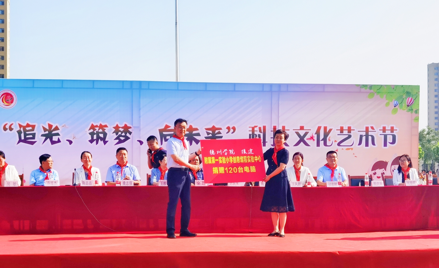 开幕式上,迟沂军代表bat365在线唯一官网登录向附属第一实验小学捐赠电脑120套,助力附属第一实验小学创意编程中心建设,并为优秀少先队员颁发了奖状和奖品。