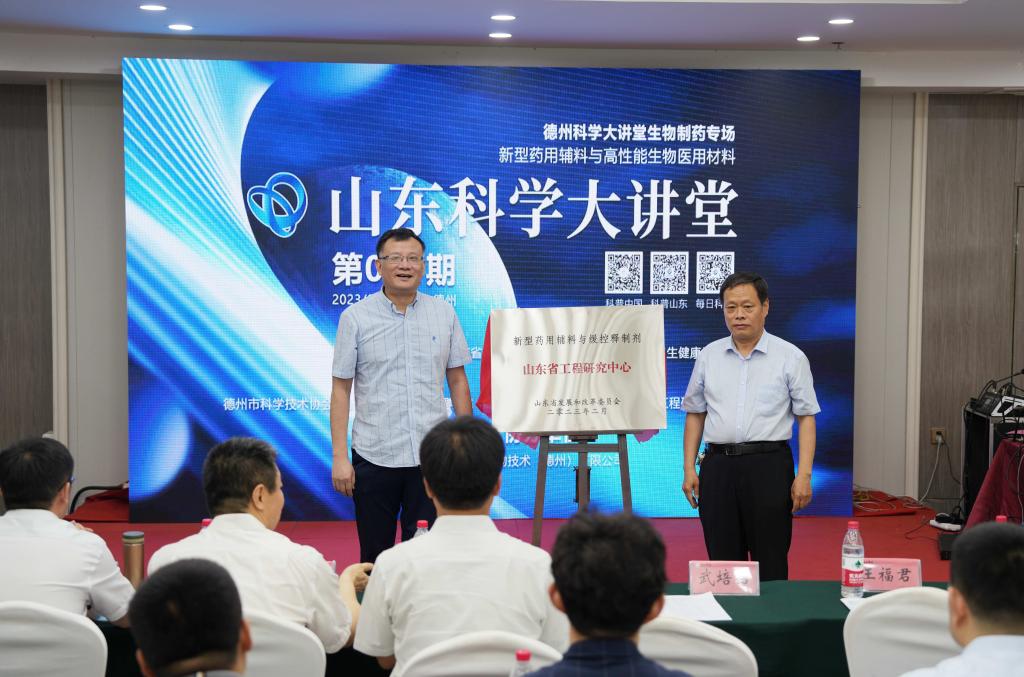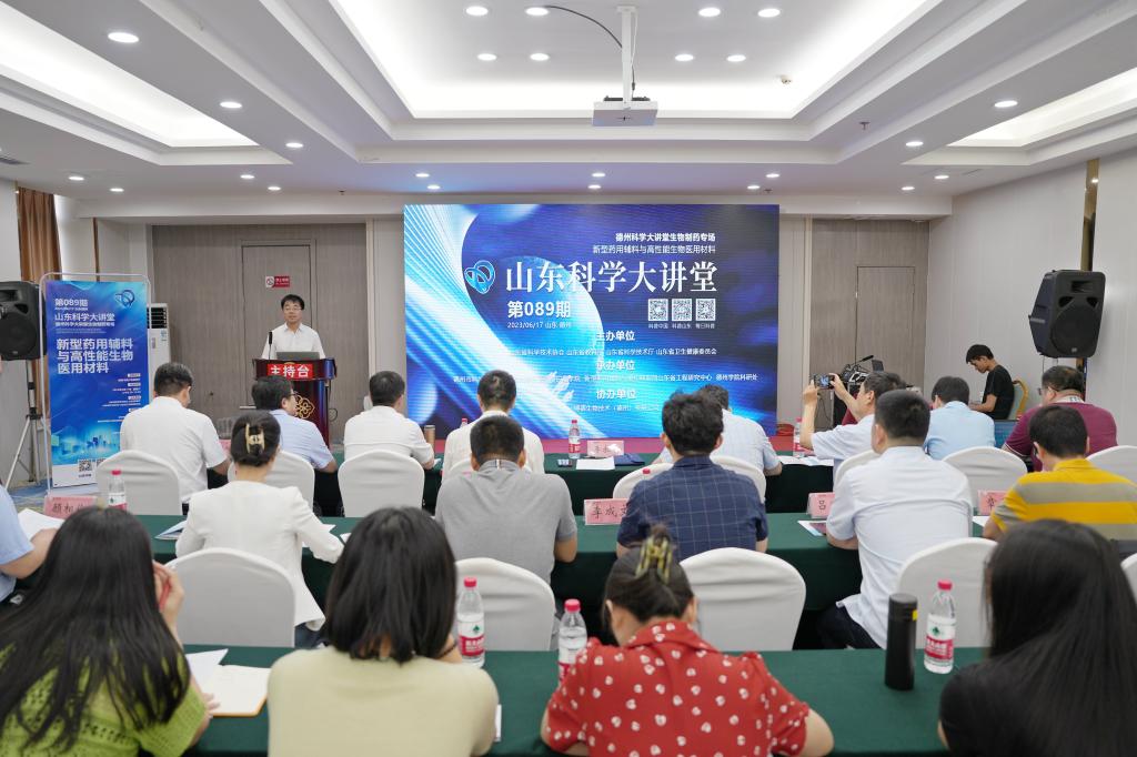 6月17日,2023年第89期山东科学大讲堂、德州科学大讲堂生物制药专场新型药用辅料与高性能生物医用材料论坛在柳湖书院3号报告厅顺利召开。bat365副校长李永平、德州市科协党组书记主席苗晓钢、德州市发改委副主任王福君、东华大学国家杰青武培怡教授、天津大学国家杰青刘文广教授、济南大学泰山学者郑庚修教授、苏州大学国家杰青严锋教授、山东理工大学杨乃涛教授、华东理工大学章弘扬教授、山东聊城阿华制药股份有限公司吕宪峰副总经理、德药制药有限公司李成文副总经理出席了论坛。