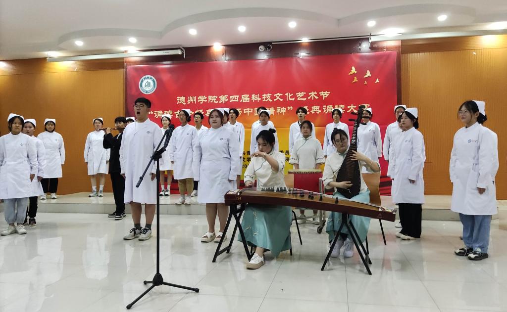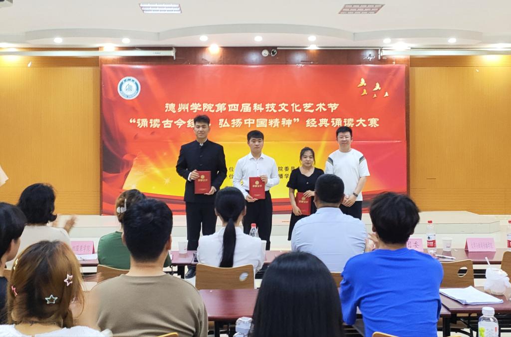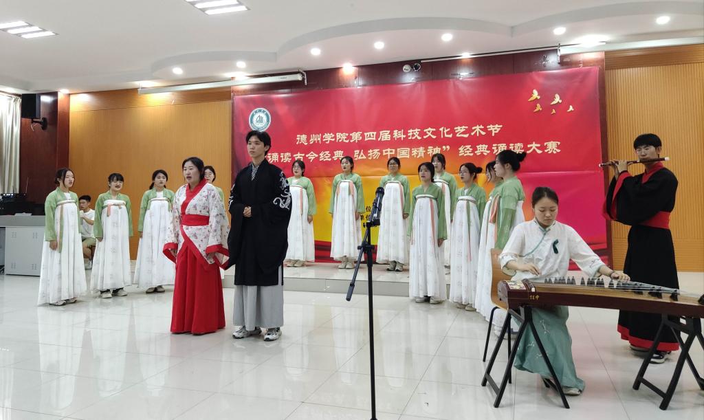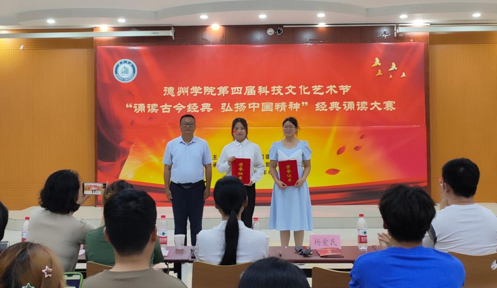 德院师生欢聚一堂,以中华文化为主线,以诗歌朗诵等艺术形式展现中国文化的源远流长和中华文明的博大精深,回顾中华文明的历史,讴歌为祖国而拼搏、为人民而奋斗的英雄,抒发德院人推动中华优秀传统文化创造性转化、创新性发展的豪情和时代担当。本次经典诵读大赛,是师生共上的一堂“思政大课”。德院师生用最深情的声音、最赤诚的情感,歌颂“爱国主义”“黄河文化”“抗疫精神”“青春力量”。经过初赛、复赛的层层选拔,共十组选手进入了决赛。选手们或深沉吟诵、悠扬婉转,或慷慨激昂、气势磅礴,或抑扬顿挫、声情并茂。《黄河颂》《念黄河》等作品,以黄河文化为背景歌颂了中华民族源远流长的文明历史和中国人民坚强不屈的斗争精神,激励中华儿女像黄河一样“伟大坚强”;《为祖国而歌》《我的祖国》《我的南方和北方》《月光下的中国》等作品,通过优美细腻的语言、真挚深情的演绎,打开了波澜壮阔的历史画卷,道出了对祖国无限的热爱与赞美;《闪耀吧,青春的火光》等作品激励青年学生怀抱梦想,敢想敢为,在全面建设社会主义现代化国家的火热实践中绽放青春风采;文学与新闻传播学院等单位带来的展现在抗击新冠肺炎疫情中形成的众志成城抗疫精神的作品《诗经·秦风·无衣》和展现不向挫折低头、忠贞不屈精神的作品《苏武牧羊》,以吟诵的方式表达了最真挚的情感。整场活动高潮迭起,掌声雷动。经过紧张激烈的角逐,评委老师们根据各组的诵读基本功、音乐选择、现场表现形式及表现力等多项标准进行量化打分,分别评选出了一、二、三等奖。