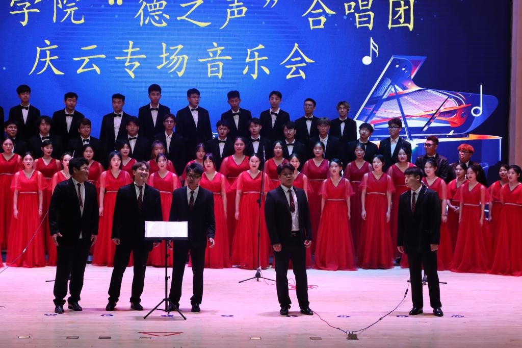 本次演出合唱团带来了《迎风飘扬的旗》《领航》等歌颂党、讴歌新时代的歌曲,铿锵的旋律、深情的歌声汇聚成一种向新向前的力量和底气,激励人们在新征程上勇往直前;《西风》《人世间》《萱草花》诉说着对人世间的悲欢离合同时表达着对美好生活的向往;《山里山外》《欢乐的那达慕》等歌曲唱出了家乡的真实场景,表达了人们对幸福生活的赞颂。演出最后,合唱团带来了经典校园歌曲《同桌的你》,音乐会现场气氛热烈,博得师生阵阵掌声。
