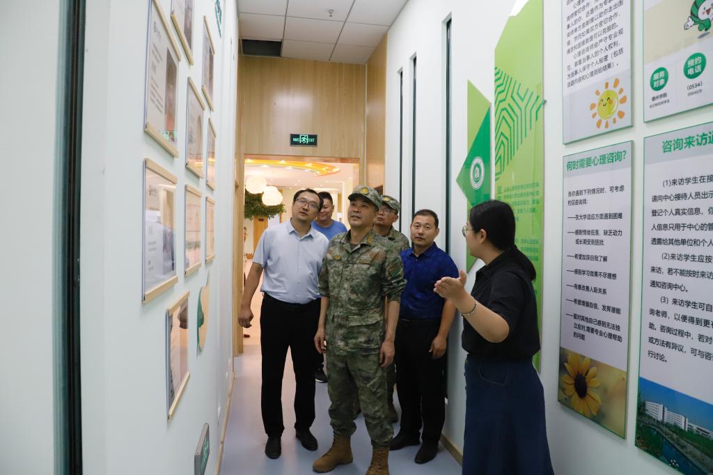 在运动场,李世军对学校军训开展情况给予充分肯定,每到一处,李世军与部分参训教官亲切交谈,询问他们军训进展、日常管理等情况,了解他们的思想状态、身体和生活状况等。检查结束后,李世军一行认真听取了学校国防教育中心退役复学大学生介绍的国防教育和征兵工作的开展情况,并参观了“一站式”学生社区学生事务与发展中心和心理健康教育与咨询中心。
