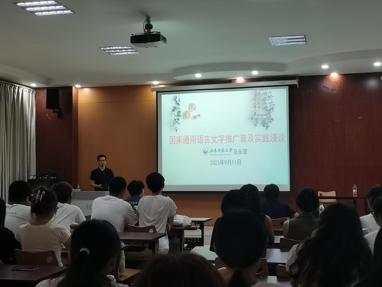 为深入贯彻党的二十大精神,加大国家通用语言文字推广力度,传承弘扬中华优秀语言文化,9月11日,bat365在线唯一官网登录特邀山东师范大学国家语言文字推广基地骨干教师马永草在博文楼328开展“国家通用语言文字推广普及实践漫谈”专题讲座。