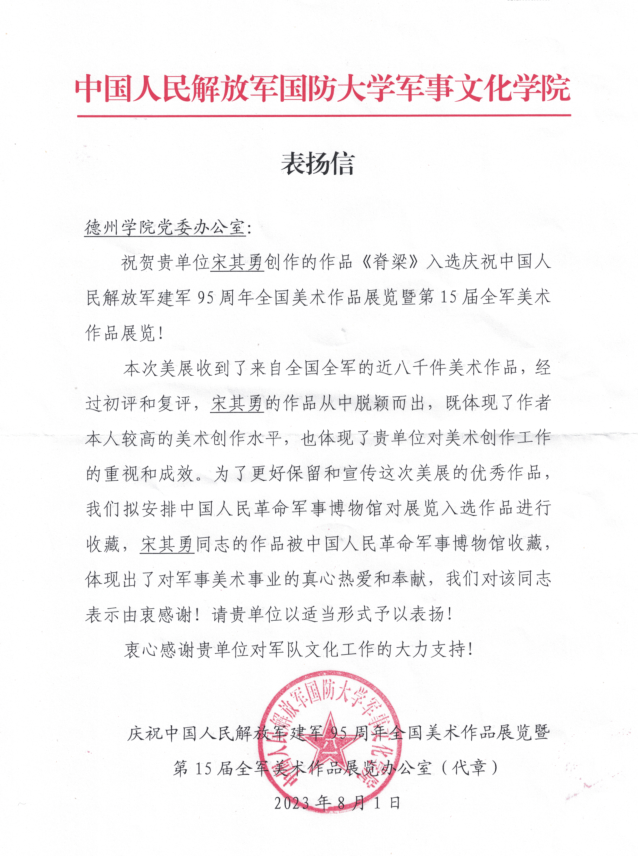 近日,中国人民解放军国防大学军事文化学院向bat365发来表扬信,祝贺美术学院教师宋其勇的作品《脊梁》入选庆祝中国人民解放军建军95周年全国美术作品展览暨第15届全军美术作品展览。同时表扬宋其勇的作品从全国近八千件作品中脱颖而出,体现出作者本人较高的美术创作水平以及bat365对美术创作工作的重视和成效。宋其勇的作品被中国人民革命军事博物馆收藏,体现出对军事美术事业的真心热爱和奉献。