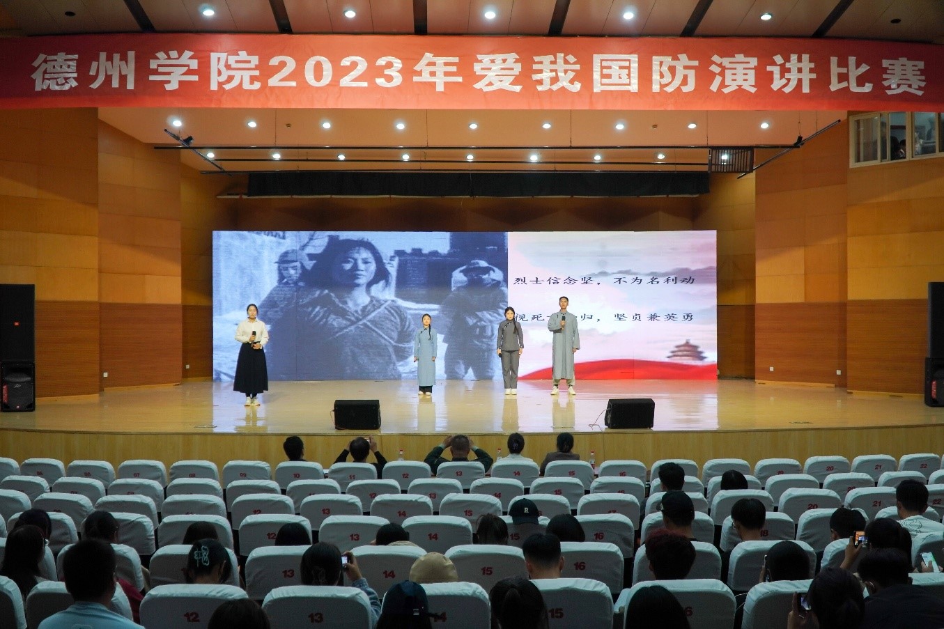 比赛现场气氛热烈,掌声不断,同学们的演讲震撼人心、铿锵有力,现场选手紧紧围绕演讲主题,从历史事件、家国情怀、时代使命等多个角度,生动阐释了同学们对国防的深刻理解,抒发了同学们对祖国繁荣昌盛的美好祝愿,进一步提高了青年大学生的国防意识、深植了家国情怀,增强了新时代的红色文化自信。