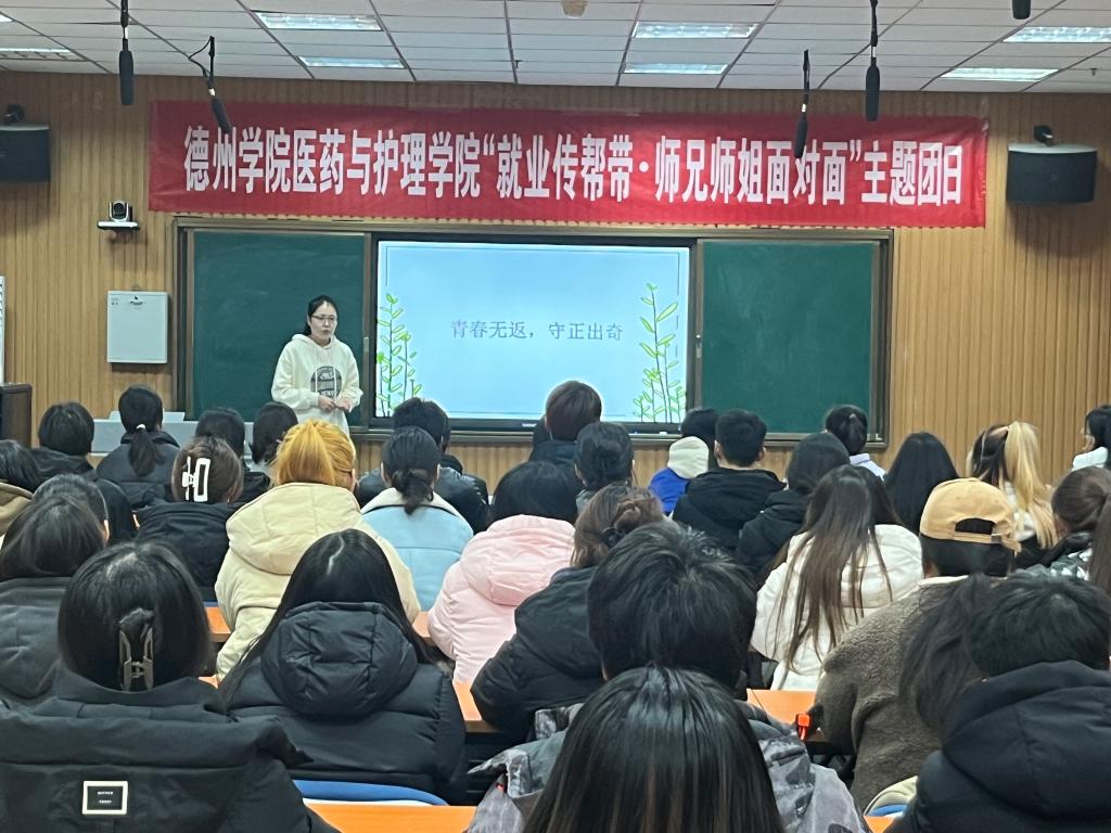 为进一步做好青年学生就业创业工作,进一步激发学生职业生涯规划意识,引导青年学生树立正确就业观、择业观,实现高质量就业,医药与护理学院团委于11月23日在厚德楼413录播室举办“就业传帮带·师兄师姐面对面——医护大学生职业生涯规划”为主题的主题团日活动。本次活动邀请了医药与护理学院优秀毕业生、校友代表2011级生物技术(生物制药方向)倪爱云和2012级护理学专业刘新新担任主讲嘉宾。活动由学院团委书记主持,相关专业200余名学生参加。