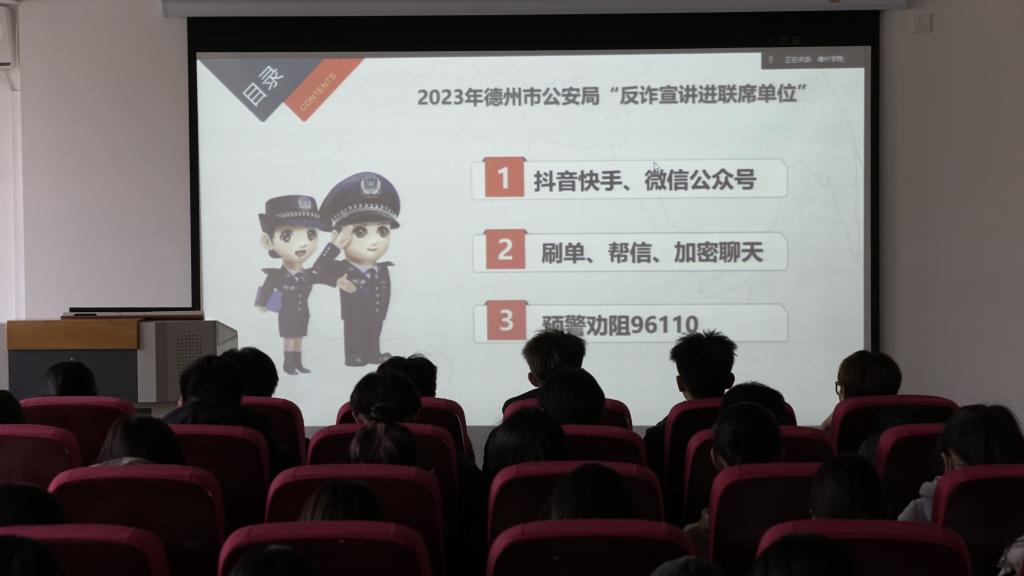 活动在厚德楼413录播室设主会场,各二级学院设70多个分会场,全校6000多名学生参加。有多年反诈经验的娄斌警官,结合学生特点,有针对性的讲解了在学生中易发生的刷单类诈骗和帮信罪等相关知识,介绍如何利用抖音、快手国家反诈中心及德警事儿公众号等甄别电信诈骗,进而避免上当受骗。