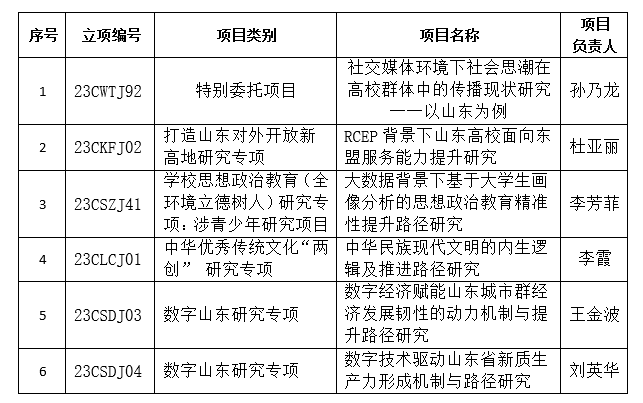 近日,山东省哲学社会科学工作办公室公布了2023年度山东省社科规划研究项目立项名单,bat3651项特别委托项目和5项专项获批立项。专项项目类别涉及打造山东对外开放新高地研究、学校思想政治教育(全环境立德树人)研究、中华优秀传统文化“两创”研究、数字山东研究等四个专项。