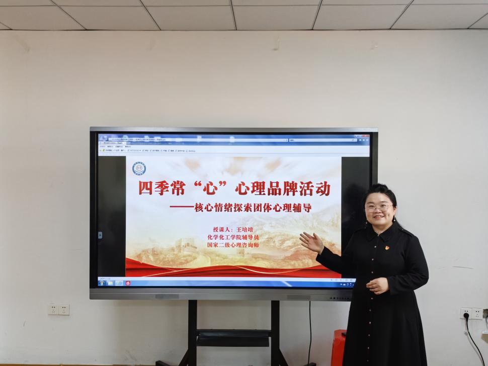 为进一步加强青年学生心理健康教育工作的针对性和实效性,积极营造和谐温馨的校园文化氛围,着力提升大学生心理健康素养。4月24日,学校依托化学化工学院“四季常‘心’”心理育人工作室与“一站式”学生社区学生事务与发展中心二楼启智堂举办了心理品牌活动——春“心”语相随之核心情绪探索团体心理辅导。本次活动由国家二级心理咨询师、化学化工学院辅导员王培培带领。