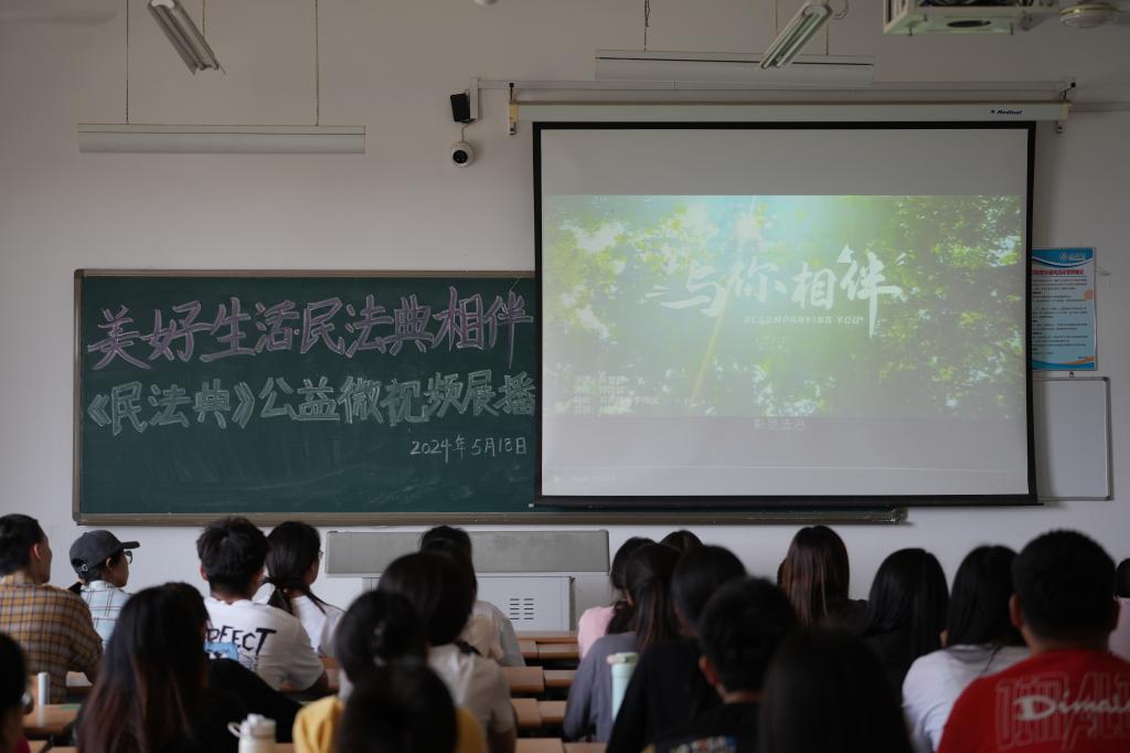 5月18日,《民法典》公益微视频展播活动举行,全校19个学院40余名学生观看。“民法典,立标杆,彰显法治促和谐……”,活动在MV《与你相伴》的悠扬歌声中展开,大家集中观看了有关婚姻冷静期、隐私权保护、遗嘱旳新形式等5部微视频。结合中国传统文化,在信誓旦旦、祸从天降、亡羊补牢等民法典成语新说中感知生活中的法律常识。