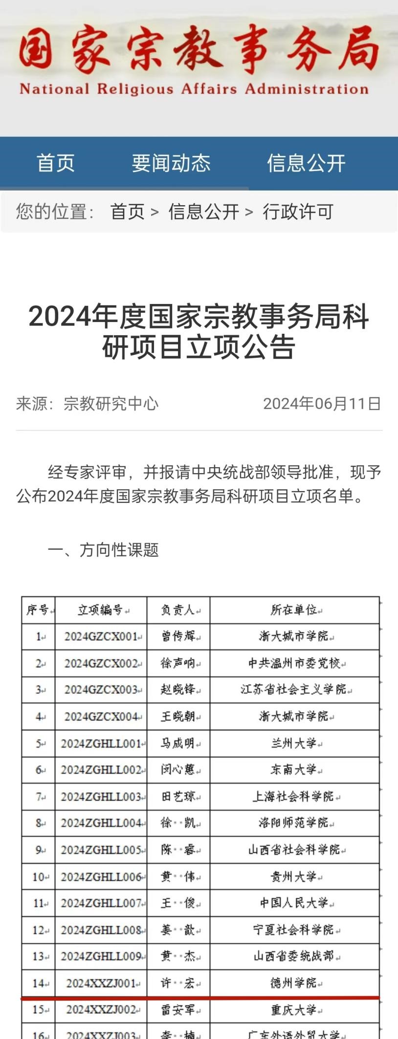 6月11日,经专家评审,并报请中央统战部领导批准,国家民族宗教事务局发布了2024年国家宗教事务局科研项目立项公告,bat365马克思主义学院许宏教授主持的科研课题获批国家宗教事务局方向性课题立项(项目编号:2024XXZJ001),资助经费10万元。