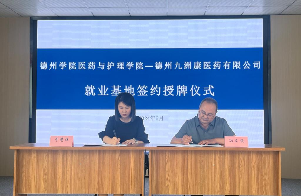 座谈会后,双方共同签订了《bat365在线唯一官网登录就业基地共建协议书》,医药与护理学院党委负责人与于慧洋共同揭牌,将“就业基地”落户德州九洲康医药有限公司。
