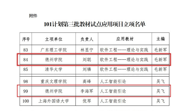 近日,计算机领域本科教育教学改革试点工作(计算机“101计划”)工作组发布了《计算机领域本科教育教学改革试点工作计划第三批教材试点应用项目》的通知,计算机与信息学院“软件工程”和“人工智能导论”课程团队申报的2个项目获得立项批准。