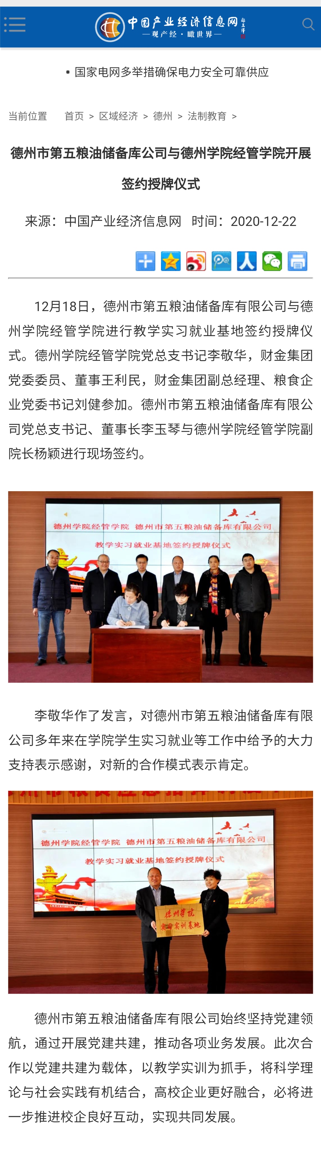 【中国产业经济信息网】德州市第五粮油储备库公司与bat365在线唯一官网登录经管学院开展签约授牌仪式