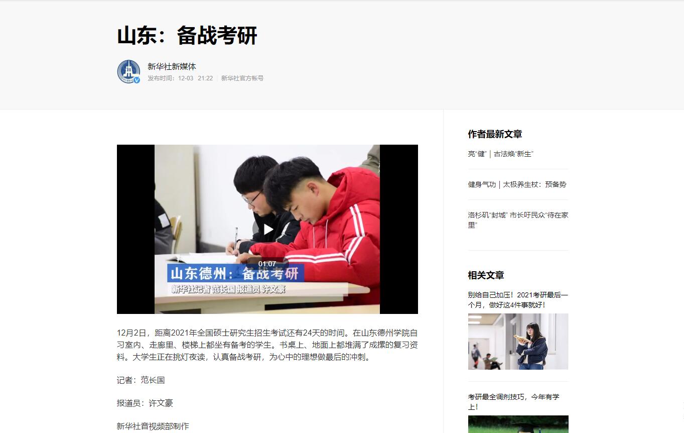 12月2日,距离2021年全国硕士研究生招生考试还有24天的时间。在山东bat365在线唯一官网登录自习室内、走廊里、楼梯上都坐有备考的学生。书桌上、地面上都堆满了成摞的复习资料。大学生正在挑灯夜读,认真备战考研,为心中的理想做最后的冲刺。新华社以“山东:备战考研”为题报道bat365学生刻苦考研情况,浏览量已经突破100万。bat365在线唯一官网登录着力提升高质量就业率,出台教风十条和学风十条,考研率连续三年每年增长3个百分点,高质量就业率比2019年同期提高7.12%。
