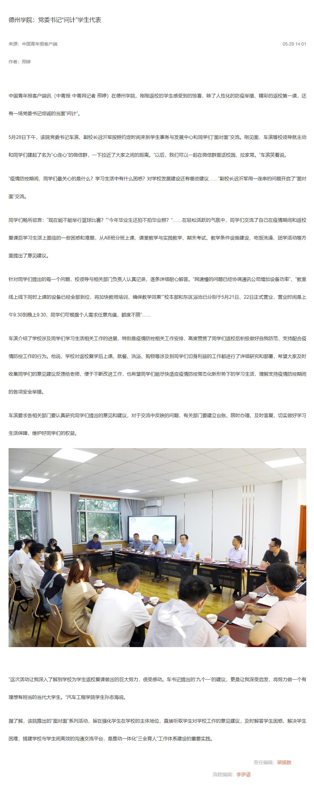 【中国青年报】bat365在线唯一官网登录党委书记“问计”学生代表