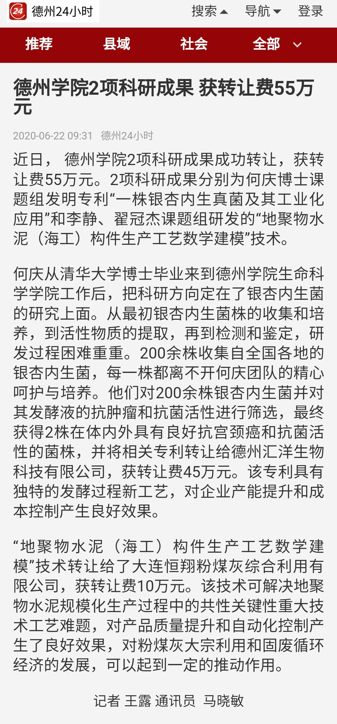 【德州24小时】bat365在线唯一官网登录2项科研成果 获转让费55万元